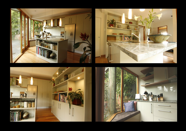In the kitchen, the floor to ceiling windows create a strong connection to the native Eastbourne bush. To reflect this, a piece of natural granite was chosen for its movement and colour. Using soft greens and browns and natural woods this draws the bush into the internal environment of the kitchen. It was necessary to remove some walls to open up the space and change the emphasises of the room, this design has three main focuses – the bush views, a reading seat allows quiet engagement with the feeling of sitting amongst the trees, the sea views, the island bench looks straight out to Wellington harbor and the social views, encouraging engagement with guests as the host cooks.